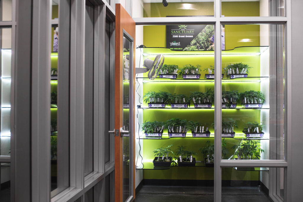 Sanctuary Dispensary revitalizes two warehouses beneath the freeway, converting one into a retail dispensary while positioning the adjacent building for future cultivation. Our scope included site planning, parking, security, lighting, exterior, and full interior design—creating a secure yet welcoming environment. The entry pairs a clean white palette with lush greenery and vibrant pop art, setting a professional, approachable tone, while playful furnishings introduce color and comfort through the secure sequence into the retail space, and the client’s strong creative direction helped shape the distinctive personality of the environment. Inside, the sales floor balances precision and energy, with rich wood perimeter millwork and glass display cases presenting products with clarity, and custom-painted metal tables showcasing transparent bud pods as sculptural focal points. Clean lines, integrated lighting, and clear circulation support staff workflow while maintaining separation from storage and delivery, as local artwork and graphic moments add depth—resulting in a project that helped set a new standard for dispensary design following legalization.
