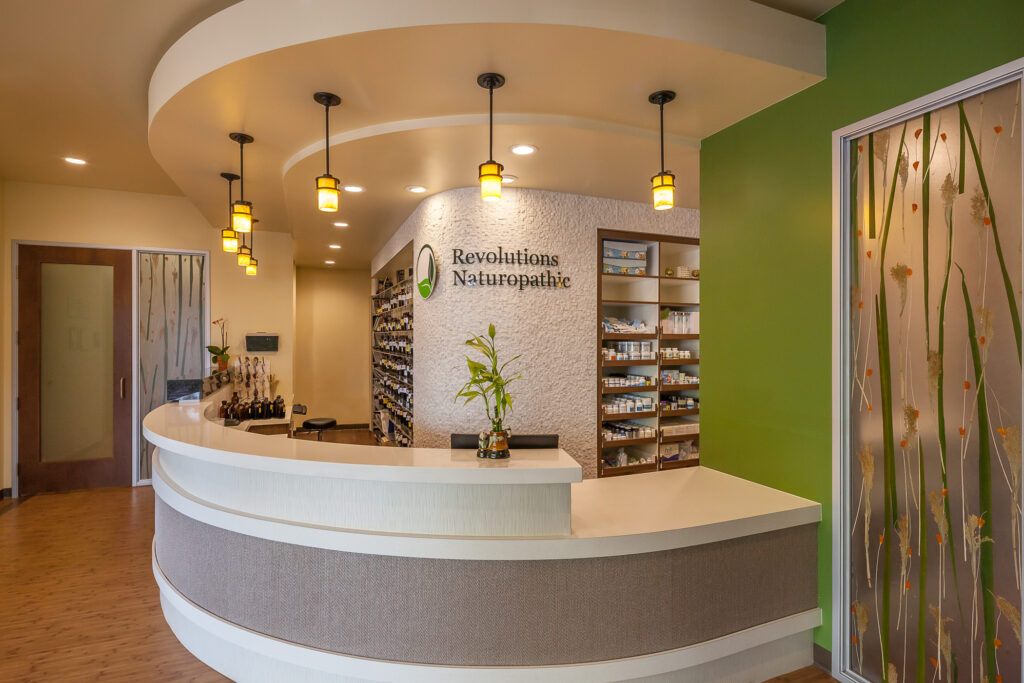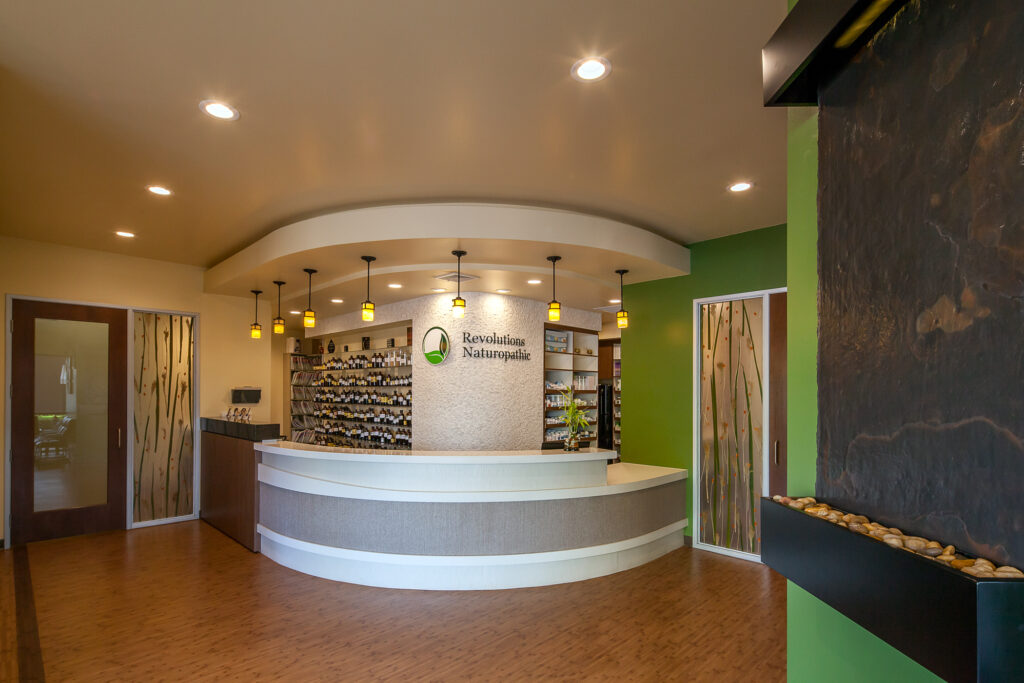 Revolutions Natural Medicine transformed a cold shell into a natural medicine clinic in Folsom, balancing clinical credibility with a warm, restorative atmosphere. The layout supports patient flow, comfort, and dignity, with reception, exam rooms, a doctor’s office, and a dedicated IV therapy lounge with privacy curtains, along with an outdoor patio that extends the experience into a quiet garden setting. Natural materials shape the interior—bamboo flooring, reeds, textured wood, and a custom water feature introduce warmth and sensory calm, while subtle apothecary references nod to herbal traditions. Mini-bay seating provides privacy without isolation, and natural light, layered textures, and acoustics create a spa-like feel within a structured medical environment—resulting in a space that brings together science, nature, and patient-centered care.