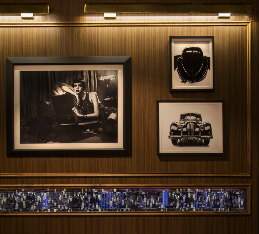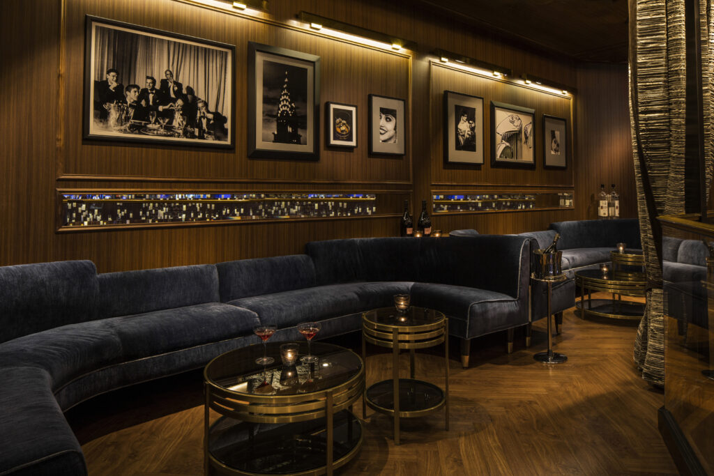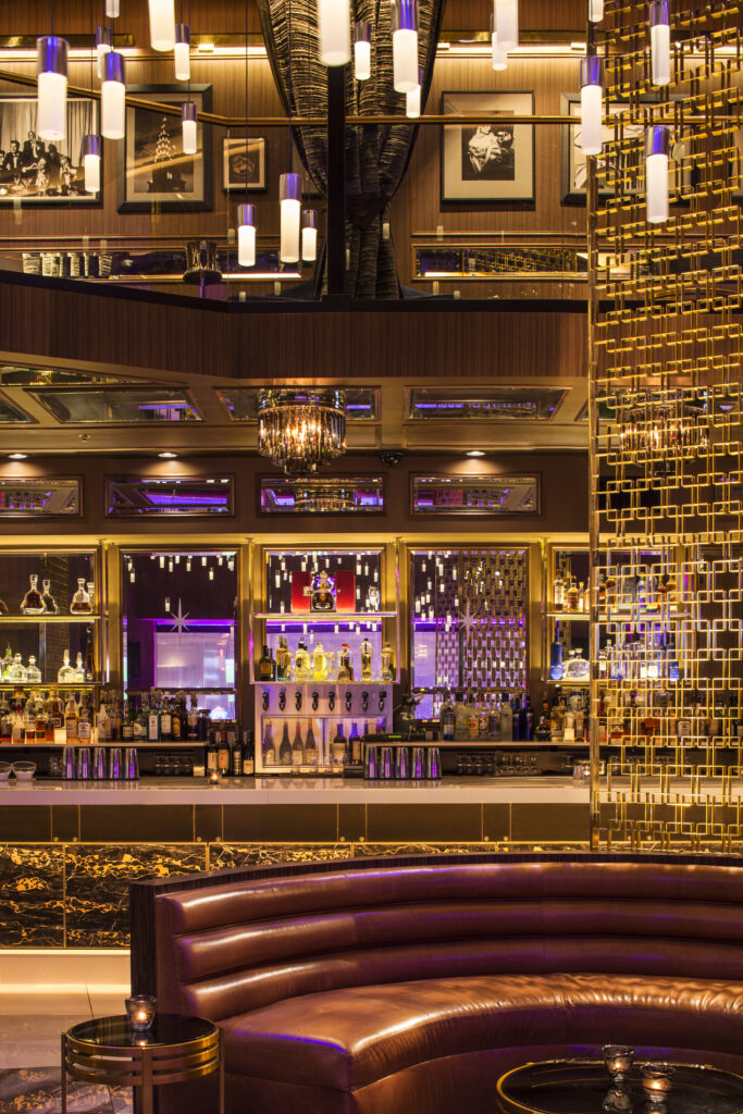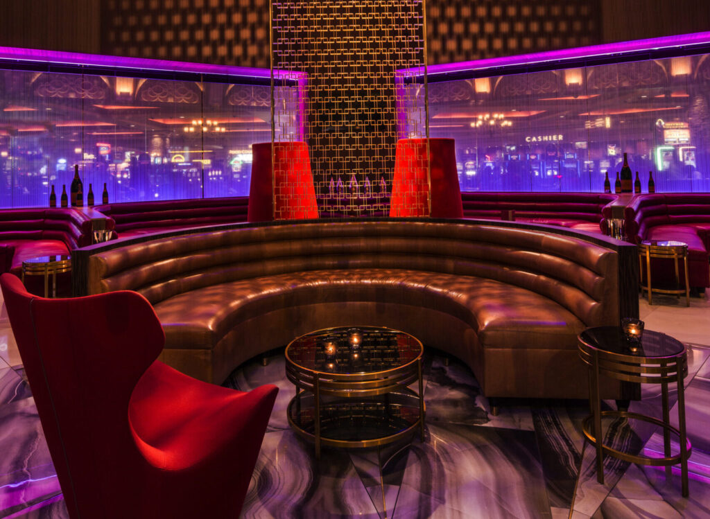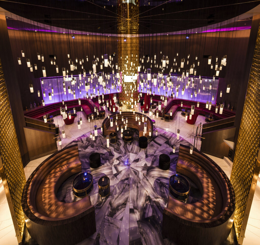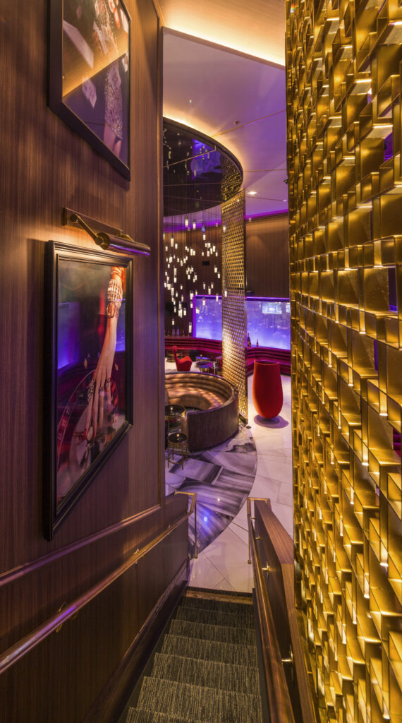 Located within Thunder Valley Casino Resort, Illusions Ultra Lounge is a super-lux, two-story bar and nightclub set at the center of the gaming floor—designed as a bold, immersive, see-and-be-seen experience. Developed in close collaboration with Thunder Valley, Mr. Important, and McCarthy, the space is organized around a circular footprint with a mezzanine overlook, layering VIP zones and intimate lounge groupings within a soaring vertical volume. The design is unapologetically luxurious: two-story wood veneer panelized walls with integrated artwork and engraved mirrors rise behind a decorative brass screen of interlocking squares, anchored by a cascading chandelier that sparkles to the main level. A reflective statement bar wrapped in mirror, brass, and a custom crystal chandelier sits atop a large-scale mosaic book-matched porcelain onyx floor, while velvet booths and a moody paneled ceiling contrast with the mezzanine’s elongated seating and brass-and-glass guardrails. A sculptural stair connects the levels, and faceted glass perimeter walls glow with recessed LED lighting—creating a theatrical, reflective, high-energy, and magnetic environment.