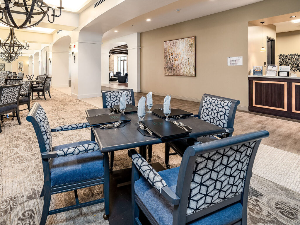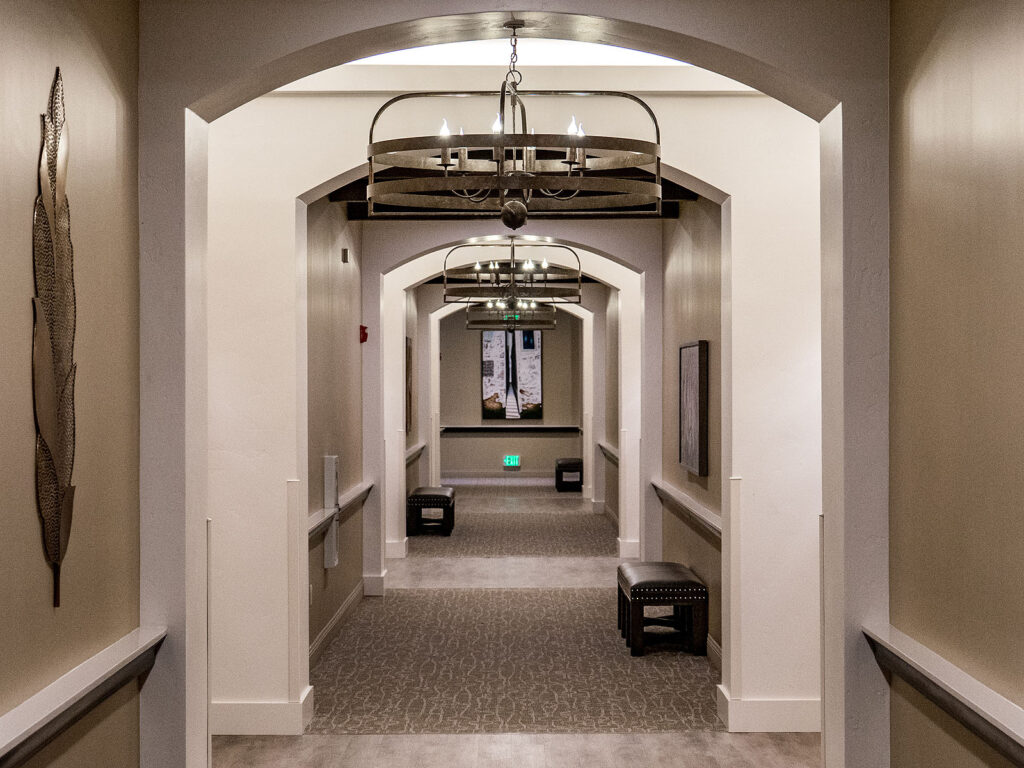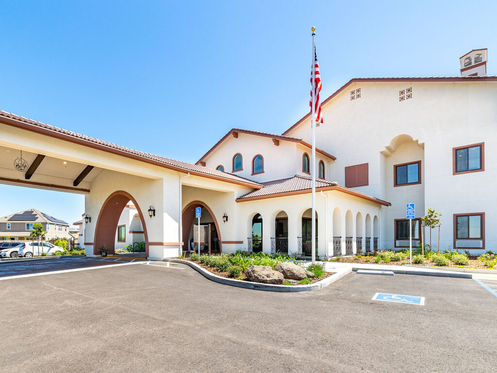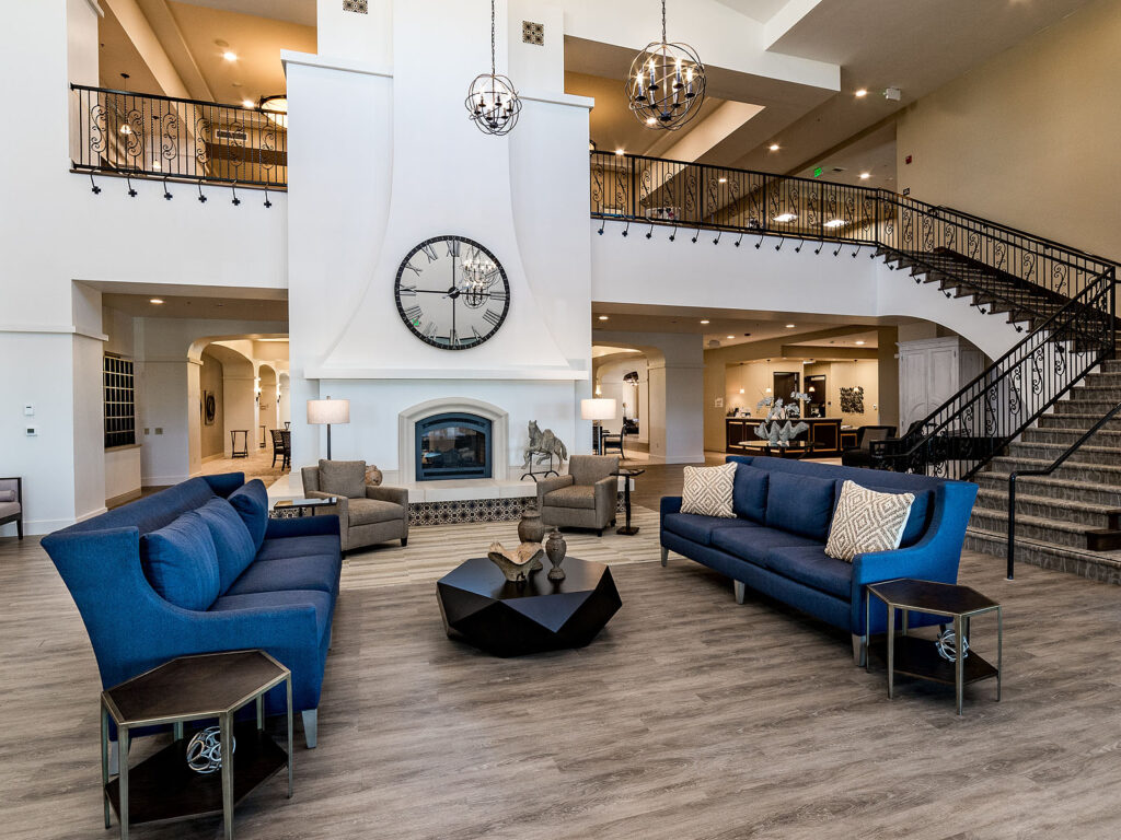 The Villas at Stanford Ranch is a luxury retirement community offering independent living, assisted living, and memory care in a warm, welcoming environment. The architecture blends classic Spanish influence with a modern sensibility, featuring arched portals, a sweeping staircase with custom ironwork, and curated art and furnishings that create a rich, tactile experience. Natural materials—wood, terra cotta, and decorative tile—add depth and warmth, complemented by a palette of light stucco, marine blues, and crisp whites, with finishes selected for both durability and beauty. Designed around health and wellness, the community encourages movement, reflection, and connection through framed views, intuitive circulation, and access to light, while suites evoke Mediterranean villas with a resort-like sense of arrival—resulting in a vibrant, restorative environment where residents can live fully and feel at home.