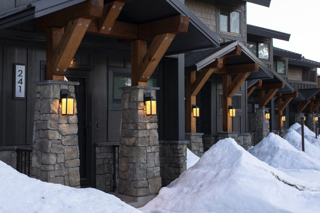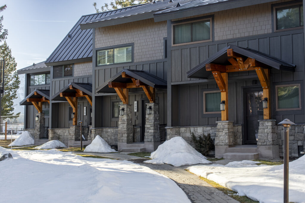 Tahoe Marina Shores is a rare lakefront residential community along the shores of Lake Tahoe, adjacent to the marina and boat launch, set within a sensitive marsh habitat first developed in the 1960s. The eight-building property reflects a careful modernization that honors its legacy and environmental constraints, updating roofs, cladding, entries, and detailing while preserving its history. The architecture draws on a modern cabin and chalet vocabulary, with heavy timber, exposed steel and hardware, stone cladding, and expansive glass paired with wood-textured panels and layered lighting to create a warm, welcoming presence. A restrained palette frames the lake, marina, and surrounding mountains, while durable materials and thoughtful detailing ensure longevity in the alpine climate—resulting in a distinctive waterfront community that blends history, environmental stewardship, and contemporary mountain living.