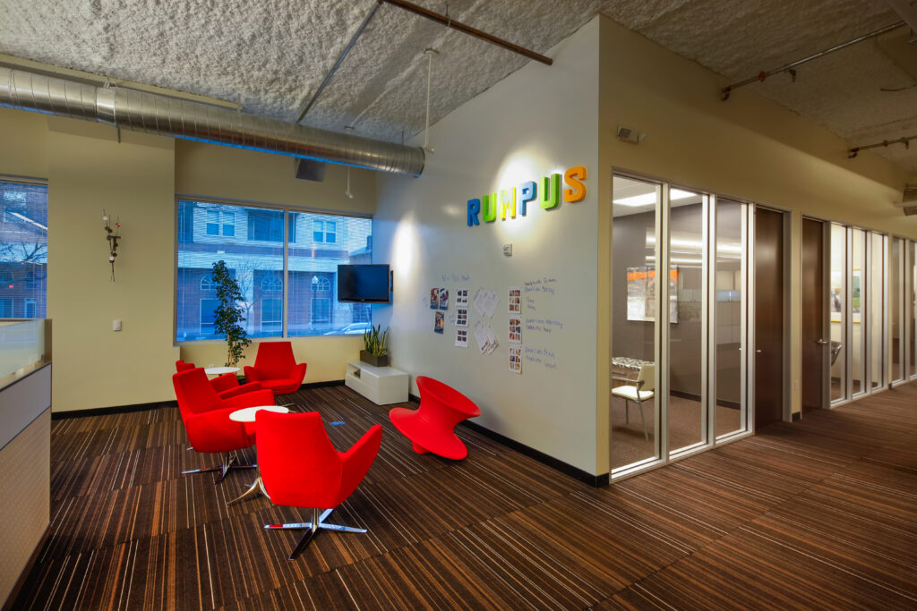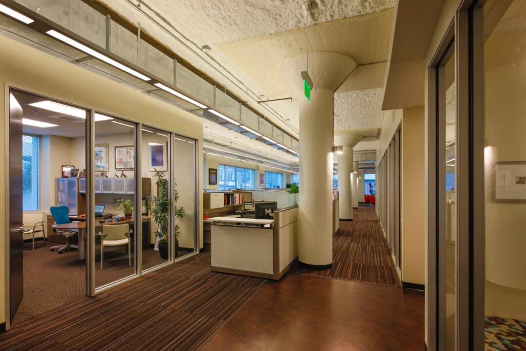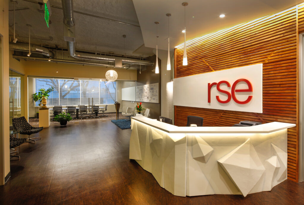 Founded by the late Jean Runyon and shaped alongside Estelle Saltzman and the executive team, RSE’s story set the tone from day one—a highly creative, social impact–driven public relations agency and steadfast supporter of the arts whose evolving culture called for a workplace that could carry both legacy and momentum. Located on the first floor of 2020 L Street, the space became an opportunity to ground that vision in architecture, where an early design blitz—sparked by a color psychology exercise and playfully dubbed “Right-brainogy”—aligned the team around movement, transparency, and curated art. A continuous circulation loop wraps a central core, supporting dynamic presentations, training, open collaboration, and a flexible break room for larger gatherings, while private offices are strategically placed within the core to free the perimeter for honeycomb workstations and collaborative zones that fully engage natural light. Daylight extends deep into the floor plate, illuminating walkways that orbit the core and reinforcing openness throughout, as an exposed high roof deck creates a refined industrial backdrop and a tailored palette allows art and expressive moments to lead—faceted forms and intentional bursts of color animate the lobby and commons, resulting in a forward-looking environment that is disciplined in its architecture, bold in its collaboration, and aligned with RSE’s founding vision while fueling the work ahead.